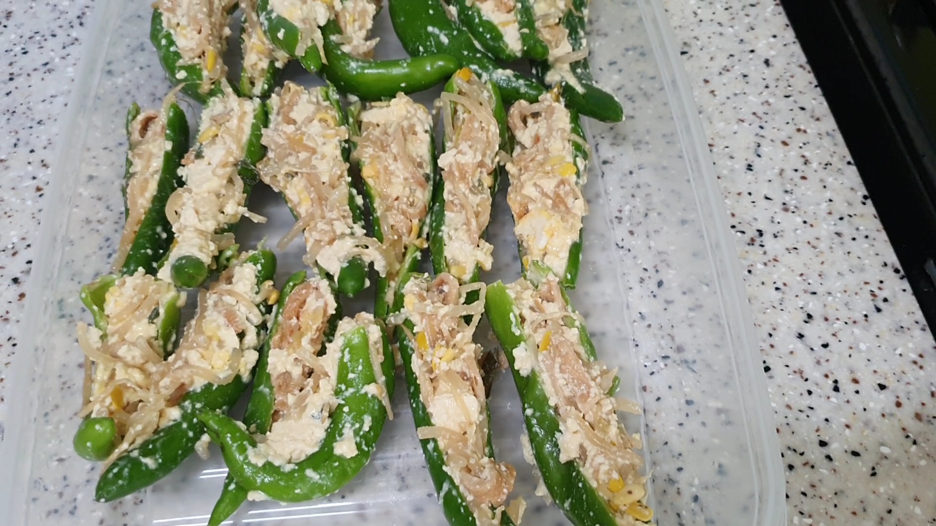 집에 있던 오이고추에 속을 꽉꽉 채워 놓고 고추튀김 만들 준비 다 됐어요.