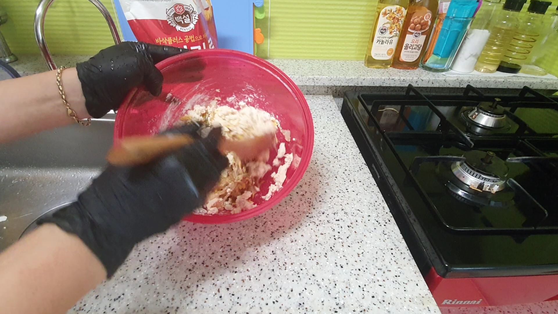 마지막으로 부침가루에 물을 넣고 튀김 반죽하고 새 기름으로 튀김 하기로....