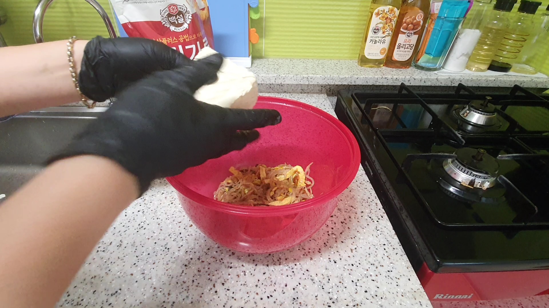 마지막으로 부침가루에 물을 넣고 튀김 반죽하고 새 기름으로 튀김 하기로....