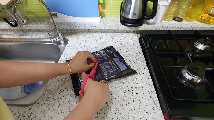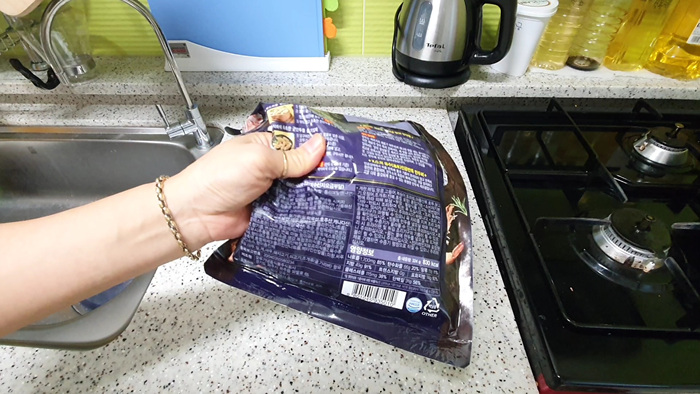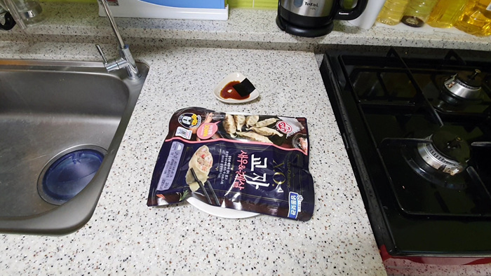 2. 만두봉지를 뒤집는다.