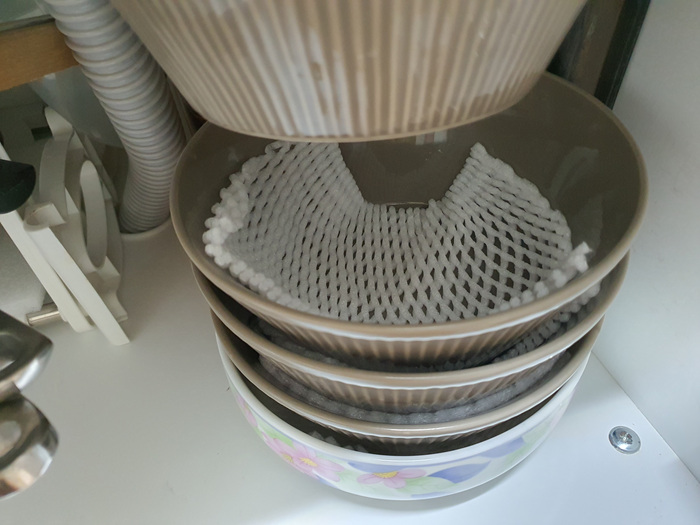 과일 완충제가 생기면 전 모아 뒀다가 그릇이나 냄비등을 보관할 때 끼워서 재활용합니다. 그릇끼리 쌓아둘 경우 간혹 깨짐 현상이 있는데요. 그 사이에 과일 완충제를 끼우면 그릇이 깨지는 염려는 물론 사이에 공간이 생겨 습기예방도 할 수 있답니다.