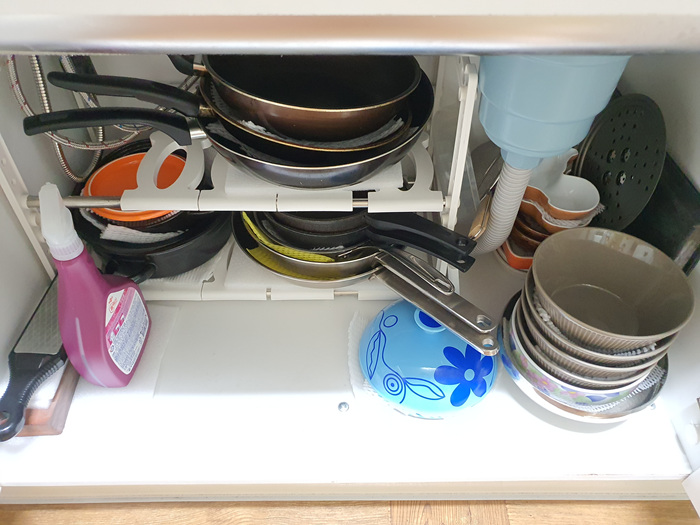 보통 전 싱크대 아래 무거운 그릇이나 냄비를 두는 편인데요. 그릇 사이에 이렇게 끼워 사용하니 꺼낼 때 그릇 소리도 나지 않고 괜찮더라고요. 그릇 소리가 나면 언젠가는 깨질 수 있다는 신호도 되거든요. 이건 우리 주부님들만 아는 그 뭔가라고 할까요.