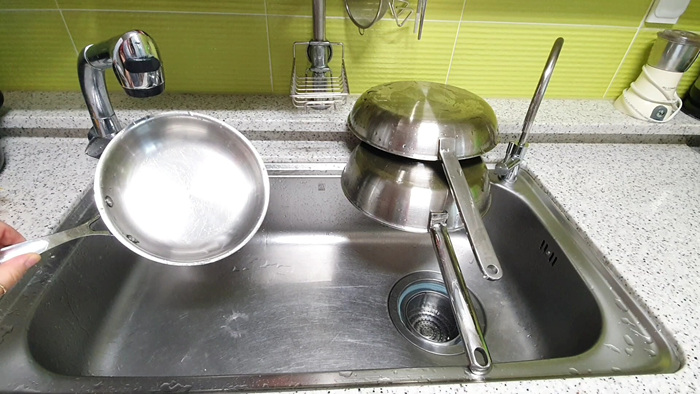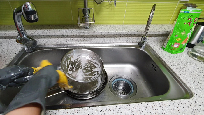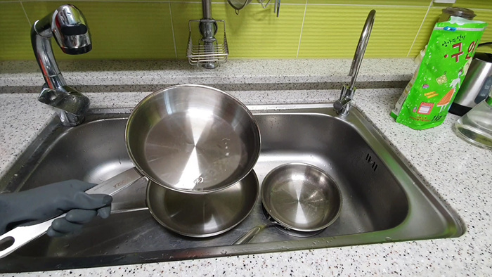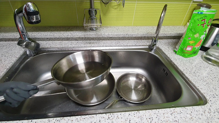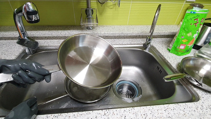 구연산으로 스테인레스 후라이팬의 얼룩을 제거했다면 주방세제를 이용해 한 번 더 설거지 후 깨끗이 헹궈주면 그 더럽던 얼룩들이 싹 다 씻겨 나갑니다.