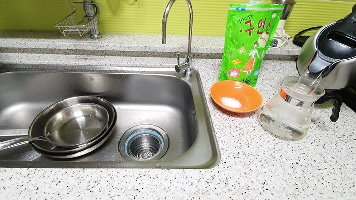 구연산 녹인 물을 얼룩진 후라이팬에 넣어 한 두번 흔들면 귀신같이 얼룩이 싹 없어져요. 이거 해 본 분들은 아마 놀라실겁니다. 눈 앞에서 바로 없어지는 것을 보게 되니 말이죠.