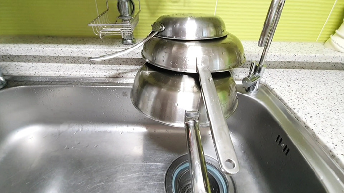 구연산으로 스테인레스 후라이팬의 얼룩을 제거했다면 주방세제를 이용해 한 번 더 설거지 후 깨끗이 헹궈주면 그 더럽던 얼룩들이 싹 다 씻겨 나갑니다.