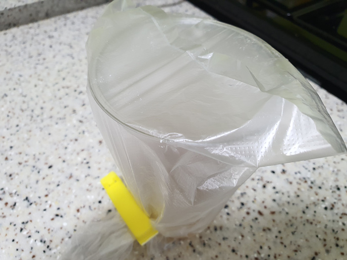 팔팔 끓은 감자물은 채에 걸러 사용해도 되지만 전 확실히 찌꺼기가 들어가지 않게 버리는 양말에 넣어 꾹 짜서 사용하기로 했어요. 아무리 버리는 양말이라도 깨끗이 씻어 놓은거니 안심요... 면보가 있다면 그것으로 사용하시면 될 것도 같아요. 전 한 번 사용하고 버릴 양말이니 그것으로 대체했답니다.