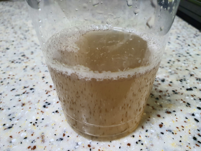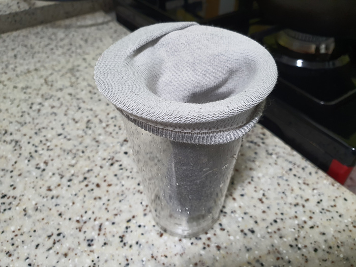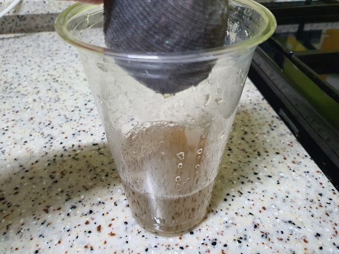버리는 1회용 아이스컵에 양말을 씌워서 감자 끓인 물을 부어서 감자물만 액기스로 뽑았어요.
