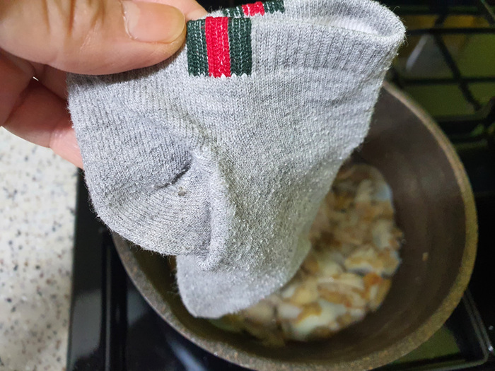 팔팔 끓은 감자물은 채에 걸러 사용해도 되지만 전 확실히 찌꺼기가 들어가지 않게 버리는 양말에 넣어 꾹 짜서 사용하기로 했어요. 아무리 버리는 양말이라도 깨끗이 씻어 놓은거니 안심요... 면보가 있다면 그것으로 사용하시면 될 것도 같아요. 전 한 번 사용하고 버릴 양말이니 그것으로 대체했답니다.