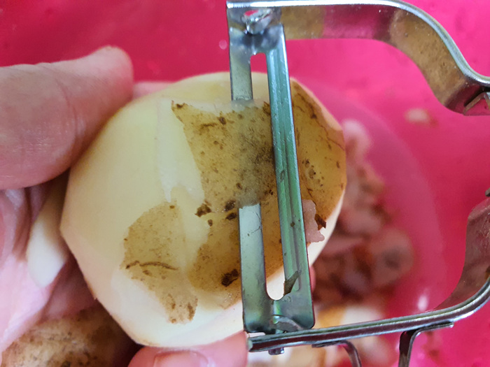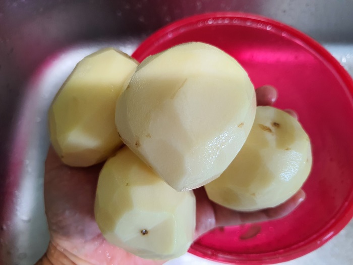 잘 씻어 놓은 감자는 물기를 제거하고 껍지를 깎아서 모아 둡니다. 이미 깨끗이 헹군 상태이기 때문에 껍질을 벗기자마자 볼에 담아 두는 것이 위생적이겠죠.