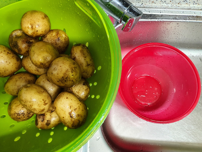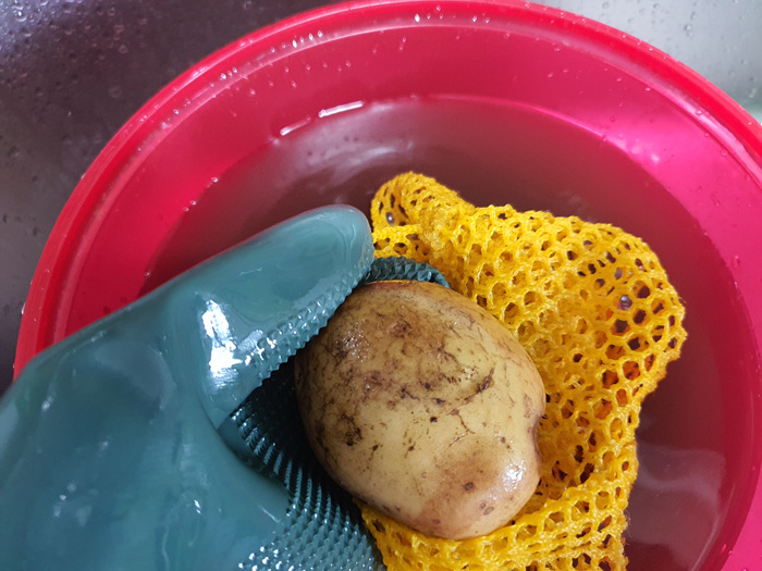 감자에 묻은 흙을 씻을때는 낡은 수세미를 사용합니다. 흠이 잘 나지 않고 흙이 은근히 잘 떨어지더라고요. 흙을 제대로 제거한 감자는 한 번 더 깨끗한 물에 헹궈 준 뒤 껍질을 벗깁니다.