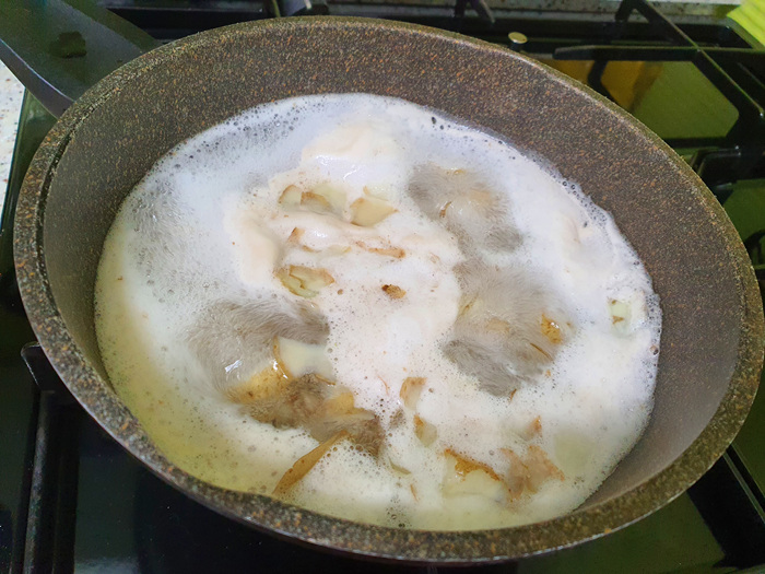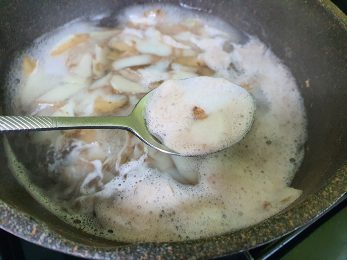감자껍질이 끓으면 거품은 숟가락을 이용해 제거해 주고 깨끗한 감자껍질물만 사용합니다.