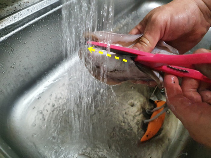 손질은 가위로 먼저 배를 자르고 내장을 꺼내기로 했다. 정말 도톰한 두께에 가위로 자르는 것 자체가 쉽지 않았다.