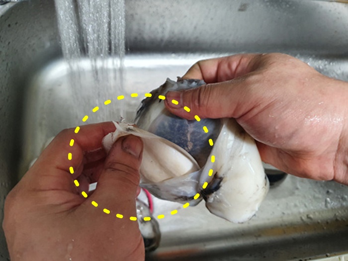 가위로 힘겹게 자른 뒤 안쪽에 있는 내장을 꺼냈다.
