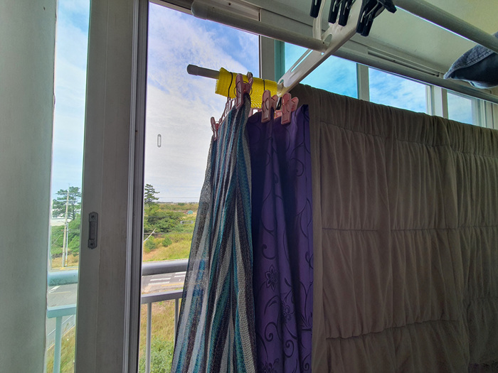 이렇게 빨래를 널어보니 세탁소 옷걸이가 밀리지도 않고 고정이 잘되었다.