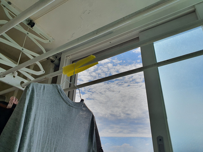 빨래를 널기 전 과일 포장망을 건조대에 올린 후 그 위에 세탁소 옷걸이를 걸었다.