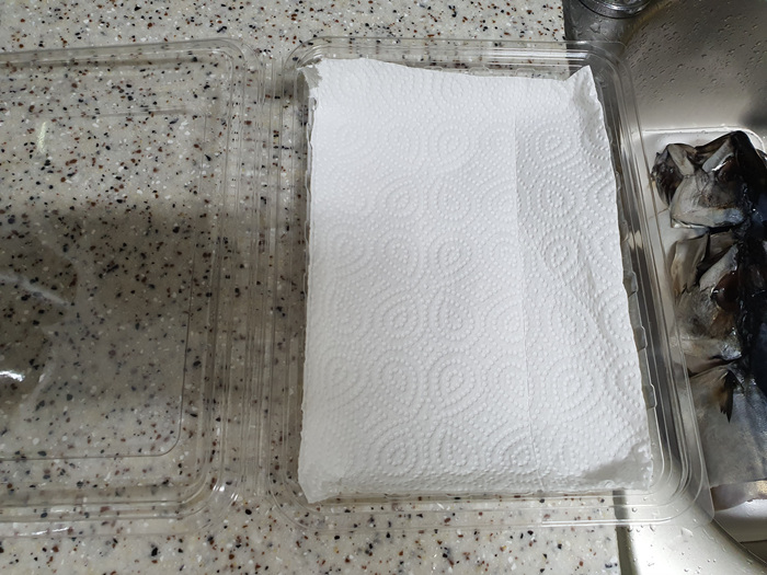 물기를 완전히 빠진 생선을 플라스틱 통에 보관하기 전에 키친타월을 깔아 준다.