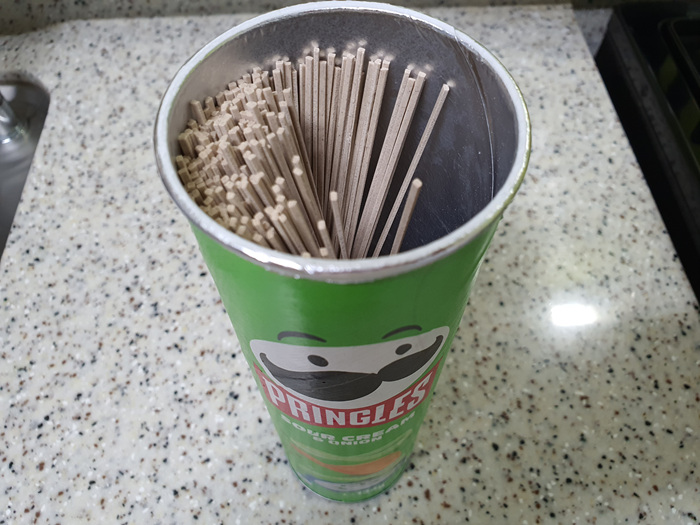 지금껏 과자통을 버리셨다면 이제 버리지 말고 국수 통으로 활용해 보세요.