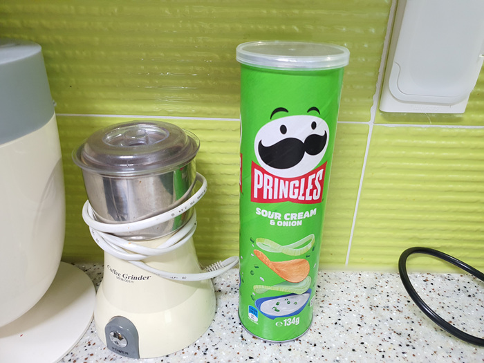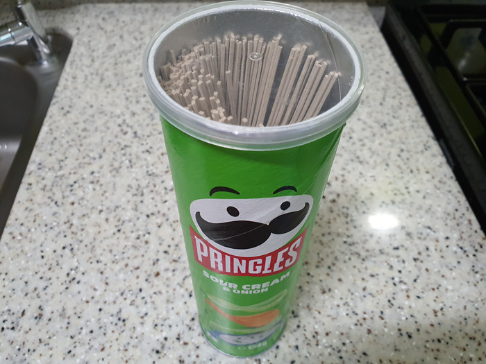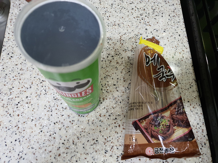 지금껏 과자통을 버리셨다면 이제 버리지 말고 국수 통으로 활용해 보세요.