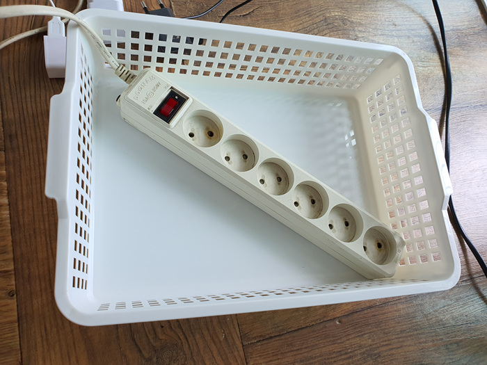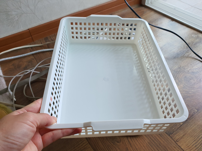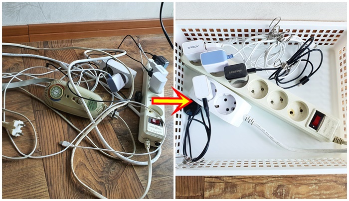 꼭 이곳에 자리를 차지하고 있어야할 전선들이면 어떻게 깔끔하게 정리할까 고민하다가 안쓰는 바구니가 생각났다.
