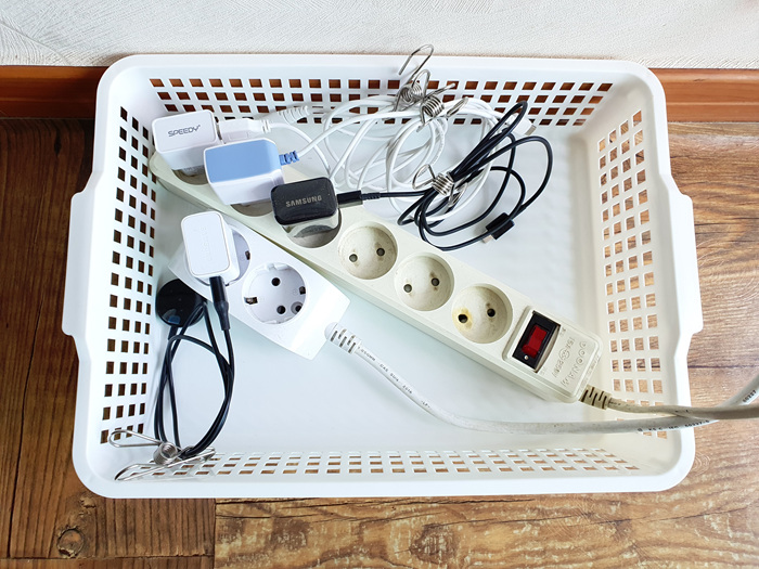 꼭 이곳에 자리를 차지하고 있어야할 전선들이면 어떻게 깔끔하게 정리할까 고민하다가 안쓰는 바구니가 생각났다.