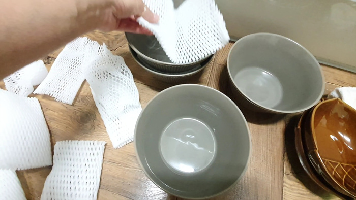 잘 사용하지 않는 그릇은 포개어서 보통 정리하는 편인데요. 이때 그릇 사이에 과일망을 끼워주면 그릇 끼리 부딪혀 깨지는 것을 방지합니다.