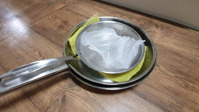 그 다음은 후라이팬 끼리 포개어 보관할때도 과일망을 깔아 줍니다.