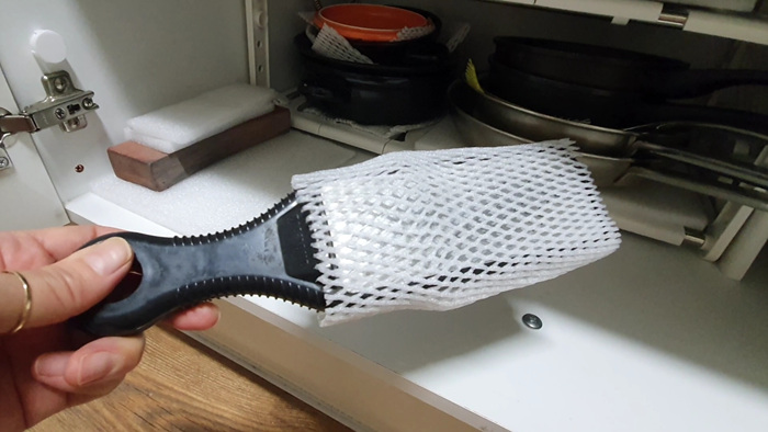 후라이팬의 생명은 절대 기스가 나면 안되는거 아시죠~ 그래서 전 꼭 과일망으로 보호해 준답니다. 그외 다양하게 주방에서 사용하고 있는데요. 칼갈이를 보관할때도 아주 잘 사용하고 있어요.