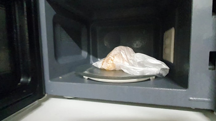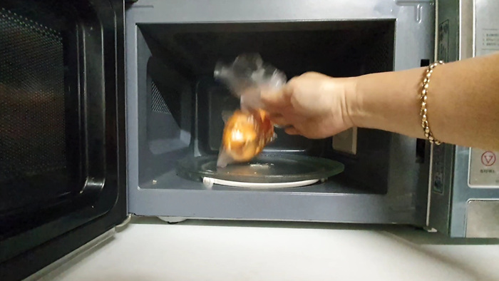 조금 귀찮은 전자렌지 청소이긴 하지만 그래도 밀감껍질만 있으면 너무도 간단히 청소가 가능하답니다. 1회용 비닐봉지에 밀감껍질을 넣고 약 3분 정도 돌려 줍니다.