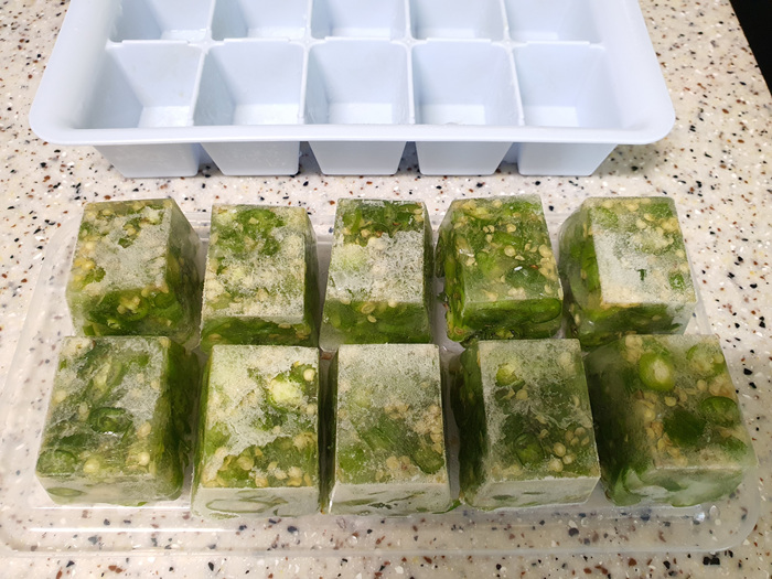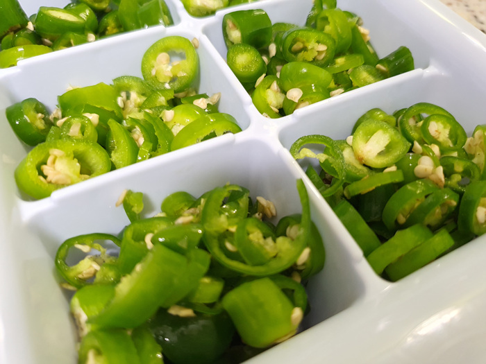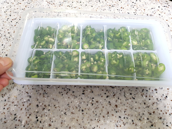 썰어 놓은 땡초를 얼음틀에 채워 줍니다. 너무 많이 꾹꾹 채우는 것보다는 1/3 정도가 적당해요.