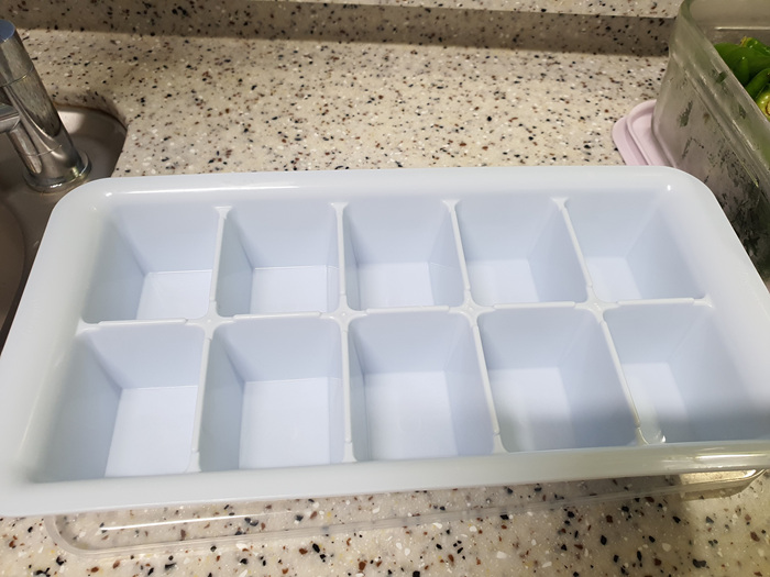 고추를 얼리기 위해선 얼음틀이 조금 크면 더 좋아요. 평소 우리가 시원하게 넣어 먹을 때 사용하는 얼음각은 작잖아요. 그것보다 조금 크면 고추도 많이 들어가고 요리할 때 하나씩 넣으면 정말 편하고 좋아요.