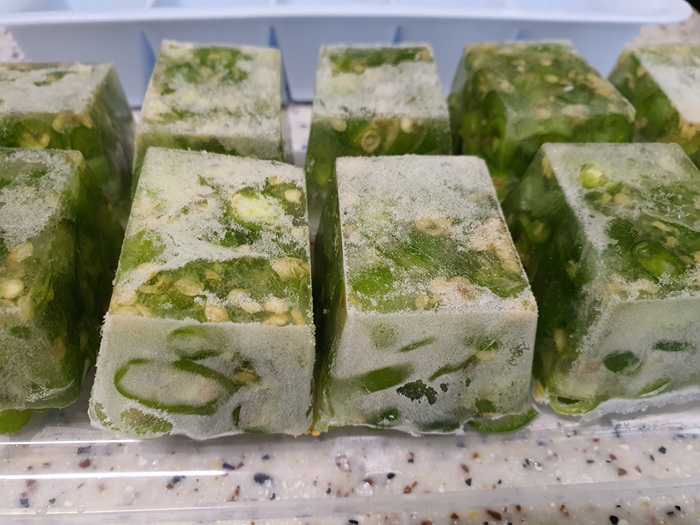 만약 얼려야 할 고추가 많다면 얼린 것은 락앤락 통에 잘 보관하고 계속 얼음틀에 얼려서 락앤락 통에 부어 주면 되겠죠.