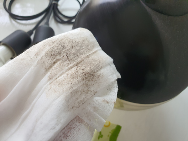 물티슈로 조명에 낀 먼지를 한 번 닦았을 뿐인데 먼지가 깔끔하게 닦여 나오는 것을 보실 수 있어요. 물론 한 번만 닦아서 끝내는 것이 아닌 깔끔한 물티슈를 이용해 한 번 더 닦아서 마무리하면 좋아요.