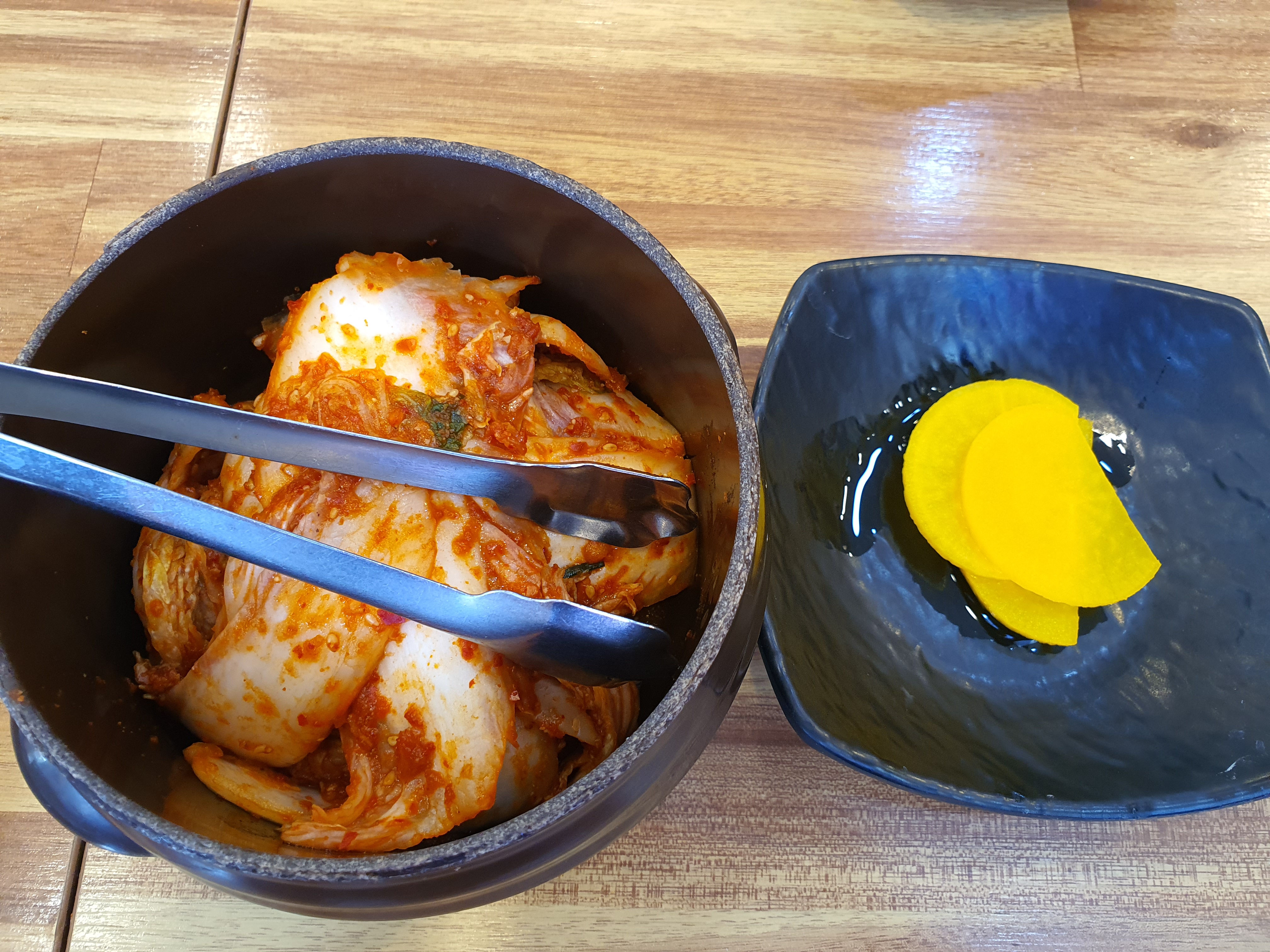 주문후 바로 반찬이 세팅되었어요. 맛있게 보이는 김치랑 단무지가 나왔습니다. 김치는 먹을만큼 덜어서 먹으면 됩니다.