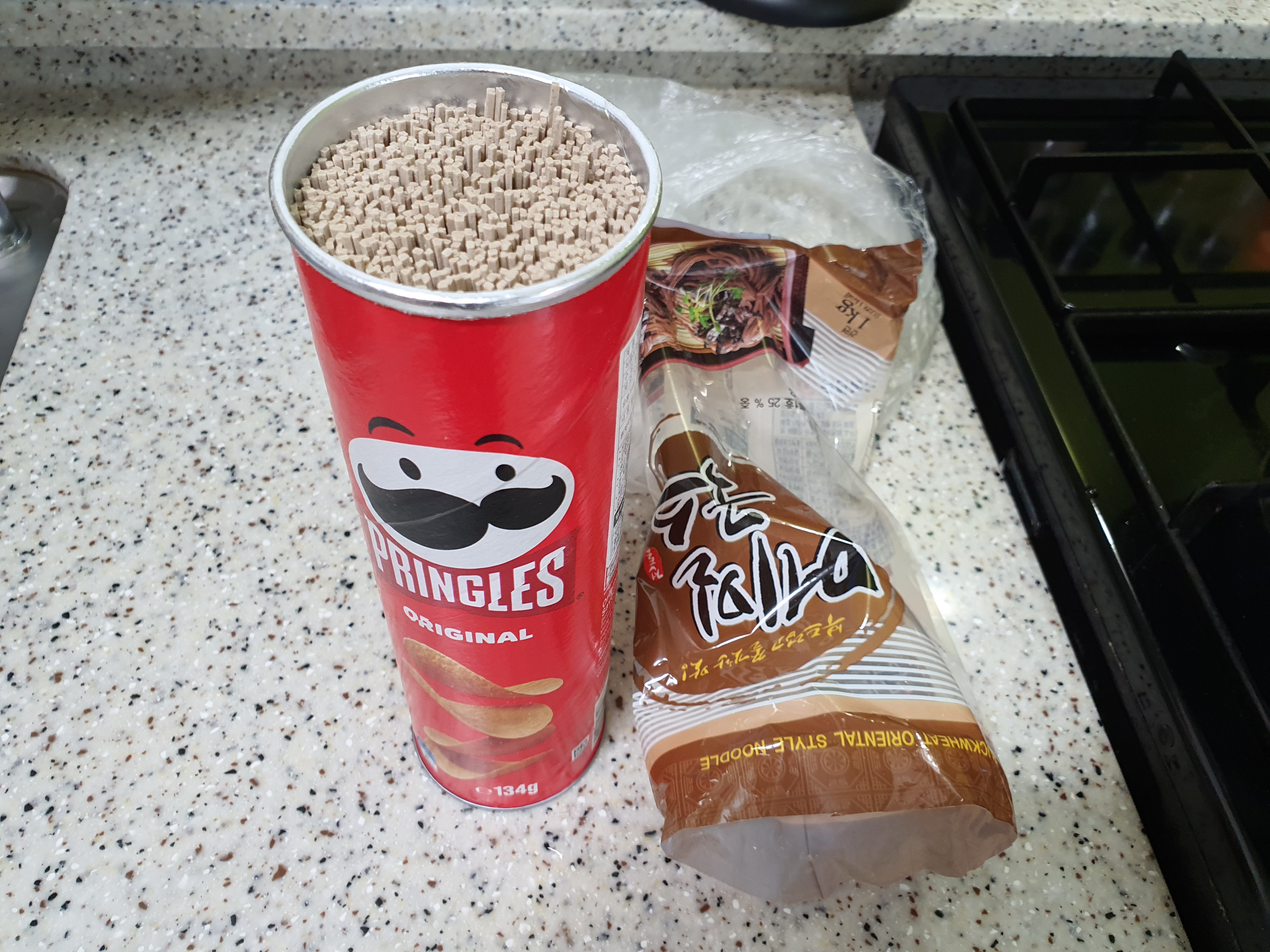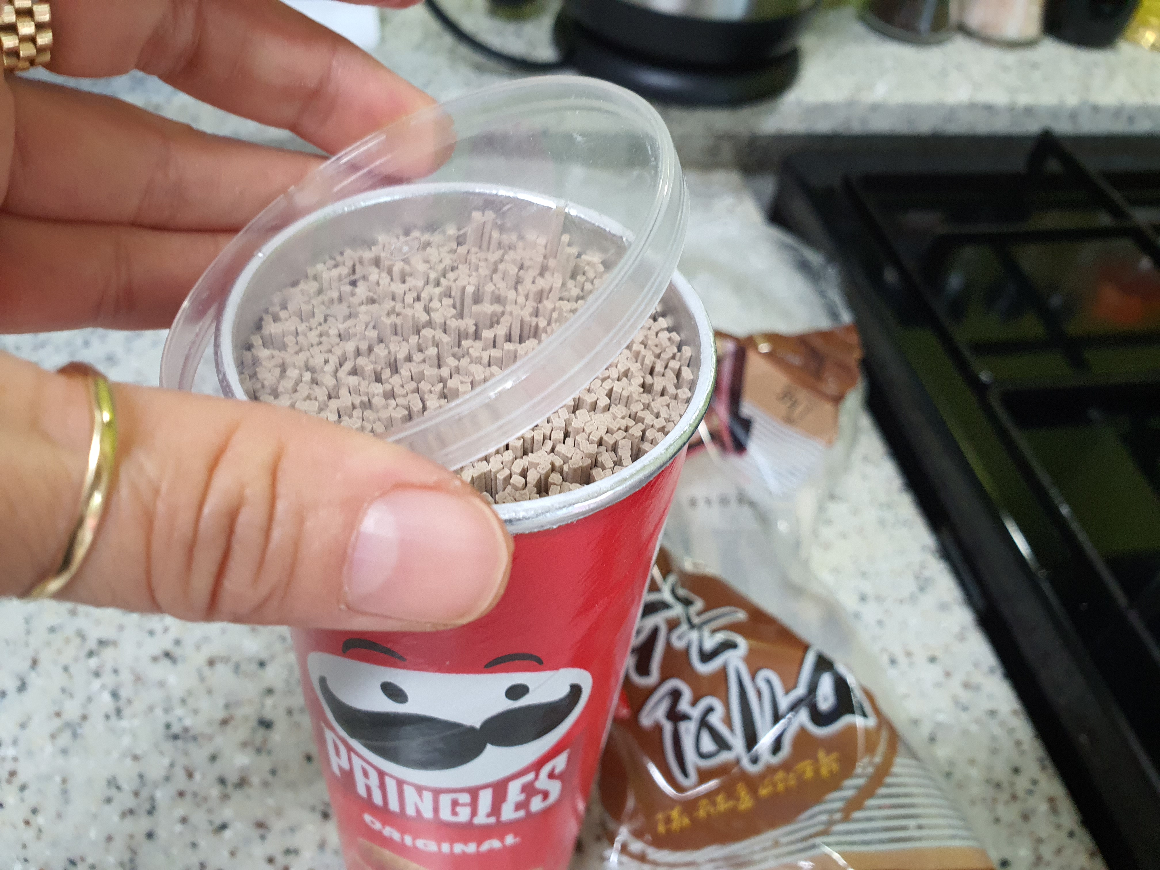 동그란 과자통 (프링글스)만 있으면 국수를 편하게 보관 가능하세요. 전 이렇게 잘 보관하는데요. 냉장고에 세워 보관하기도 용이하고 무엇보다도 국수가 부서지지 않아 좋더군요.