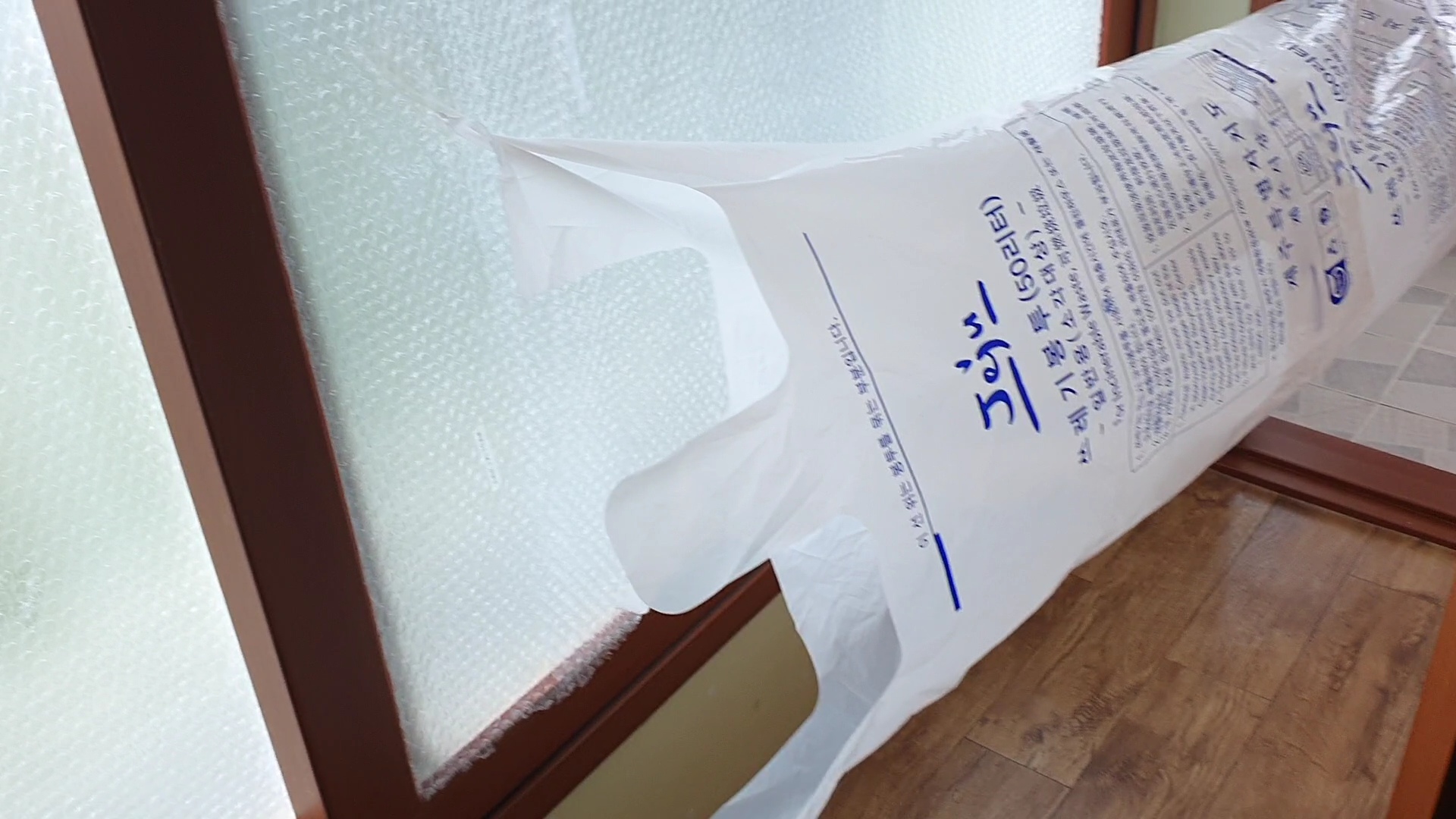 방으로 찬 바람이 바로 들어올 수 있게 쓰레기봉투를 하나 둘 연결해서 바람길을 만들었습니다. 사실 우리 집엔 베란다와 연결된 방이 하나 있는데 한 여름에 이방에 에어컨을 연결하면 빵빵한 시원함은 보장하거든요. 하여간 조금 조잡해 보이긴 하지만 괜찮은 생각인 것 같아 남편이 하는 대로 따랐죠.