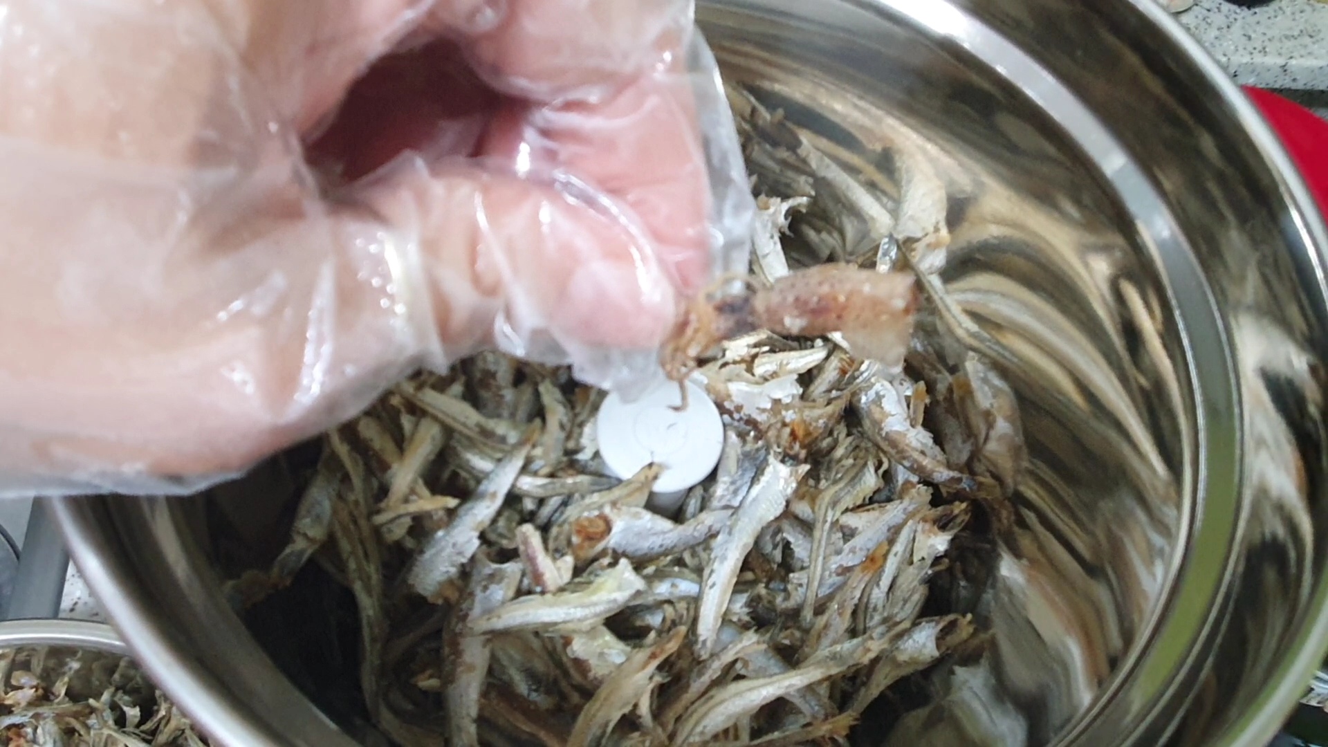 멸치를 가루로 분쇄하기 전 해야 할 일이 있어요. 그건 바로 멸치 똥 따기! 생각만 해도 귀찮음이 밀려왔지만 어쩌겠어요. 터져 나가는 냉장고 정리하려면 이거라도 부피를 줄여야 하니까...