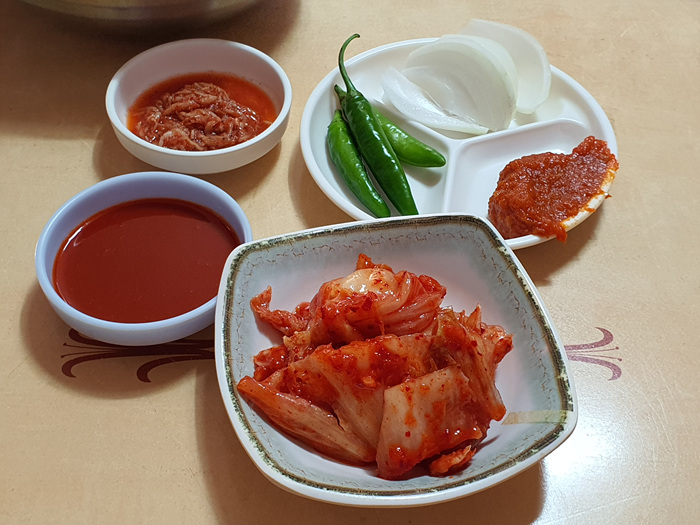국밥을 주문하면 기본 찬은 김치와 젓갈 그리고 고추, 양파가 나온다. 1인분 식사도 가능한 곳이니 부담 없이 혼밥을 즐길 수 있다.