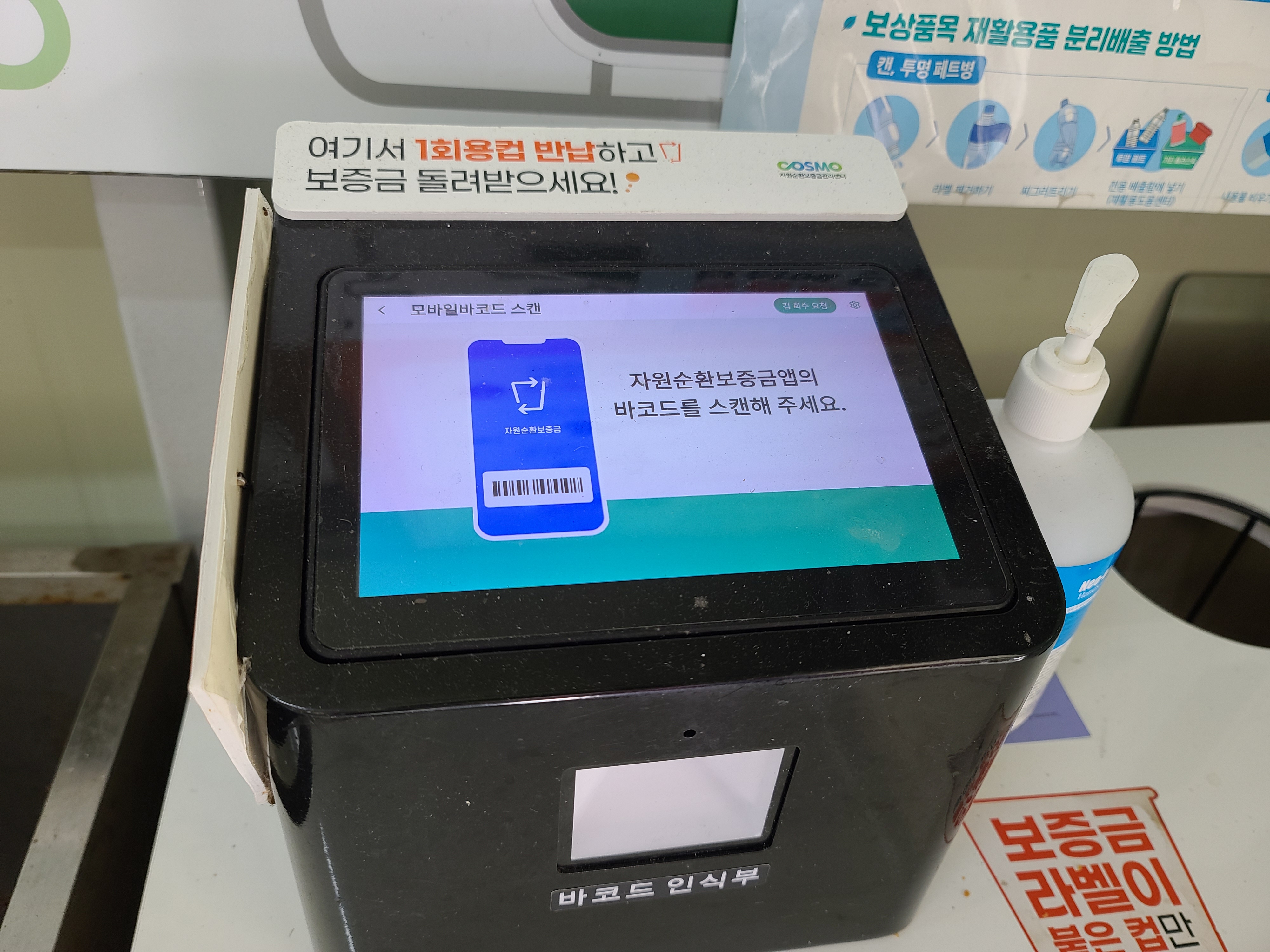휴대폰 앱에 자원순환보증금을 깔면 누구나 쉽게 이용 가능합니다. 바코드를 찍은 뒤 반납할 1회용 컵 통에 넣으시면 되세요.