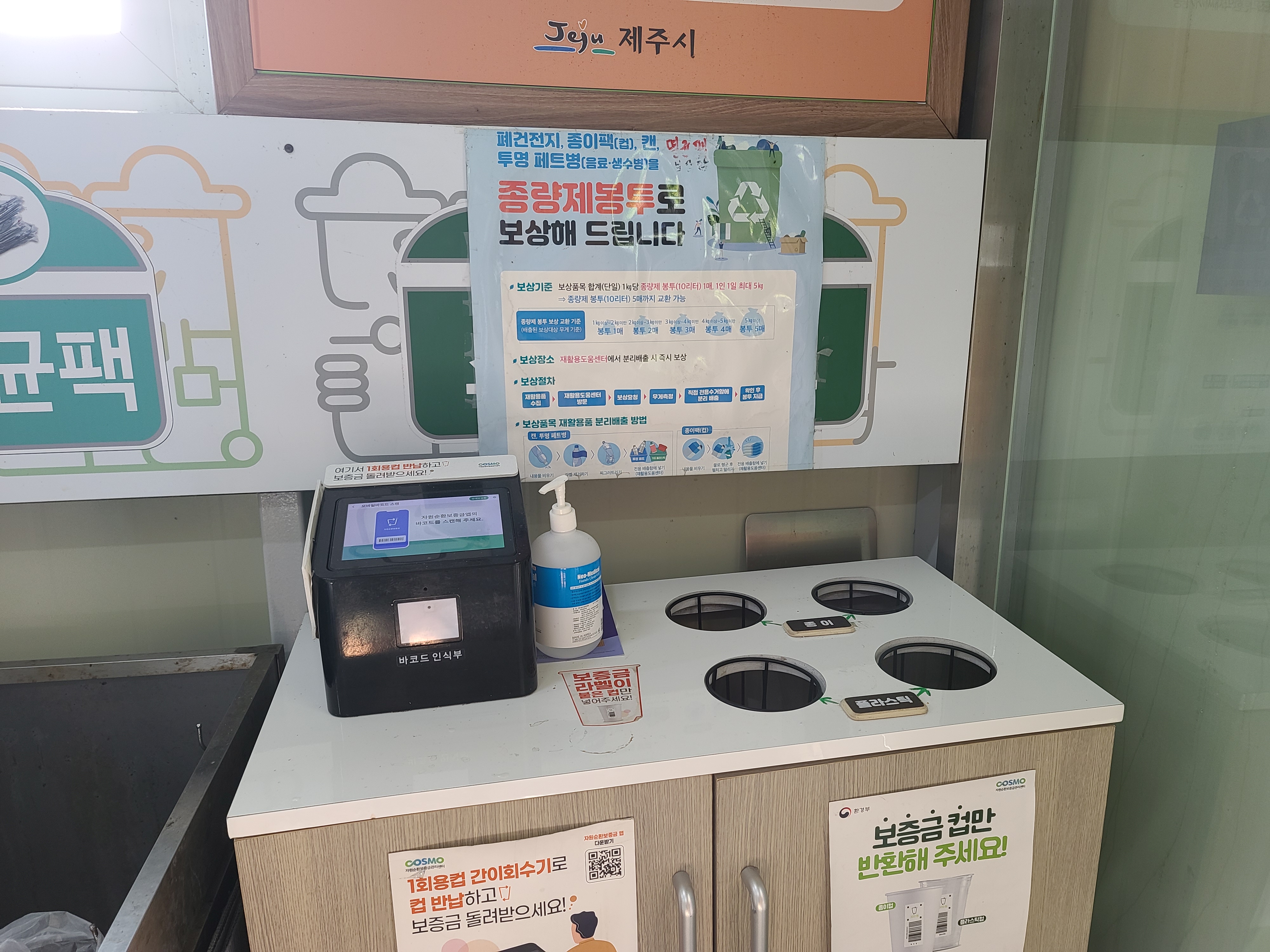 이곳은 재활용품 분리 배출 하는 곳인데요. 입구에 컵 반납하는 기계가 있어요.