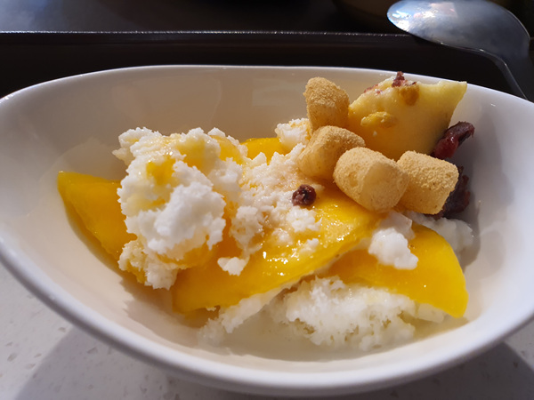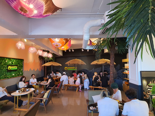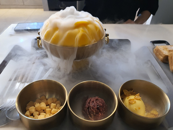 이곳에선 대부분 망고를 넣어서 만든 음식들이 많이 나가는데 특히 망고빙수가 인기만점이라고 하더라고요. 그래서 우리도 망고빙수를 주문했죠. 가격대는 좀 있긴 하지만 그래도 신비로움과 재미 그리고 맛도 있어 돈이 별로 아깝지 않을 정도로 괜찮았던 것 같아요. 망고빙수를 주문하면 팥, 인절미 그리고 망고 아이스크림이 따로 나옵니다. 먼저 망고를 걷어 내어 먹고 나머지 재료를 넣어 같이 비벼 먹으면 되는 그런 방식이예요.