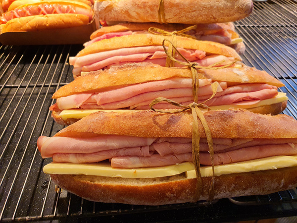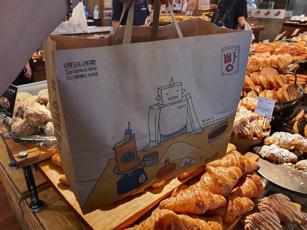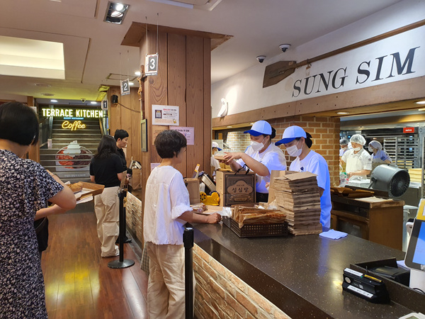 무엇보다도 성심당 빵집이 유명한 이유는 바로 바로 만들어서 나온다는 점이 아닐까해요. 잠봉뵈르도 만들자마자 손님들이 트레이에 막 담더라고요. 저도 맛있어 보여서 담았지만요. 대부분 하나씩 종류별로 구입해 가는 분들이 많았고요. 아래 사진처럼 박스로 포장된 것을 구입해 가는 분들도 있었어요.