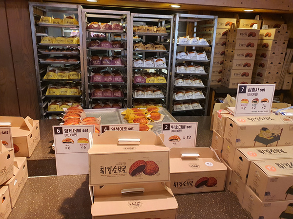 무엇보다도 성심당 빵집이 유명한 이유는 바로 바로 만들어서 나온다는 점이 아닐까해요. 잠봉뵈르도 만들자마자 손님들이 트레이에 막 담더라고요. 저도 맛있어 보여서 담았지만요. 대부분 하나씩 종류별로 구입해 가는 분들이 많았고요. 아래 사진처럼 박스로 포장된 것을 구입해 가는 분들도 있었어요.