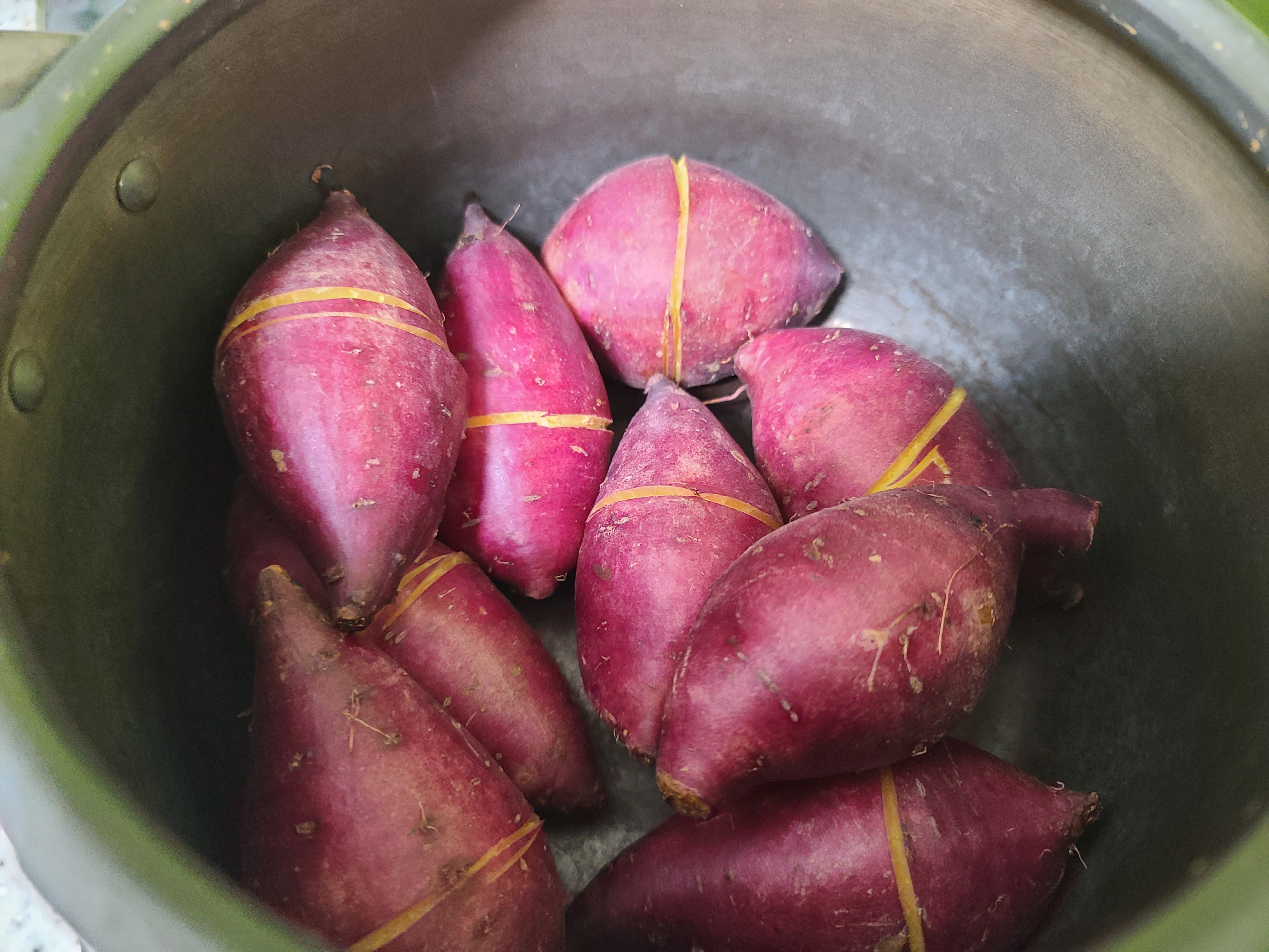 고구마 중앙에 이렇게 칼집을 해 놓은 이유는 삶은 뒤 껍질을 쉽고 수월하게 벗기기 위함입니다.