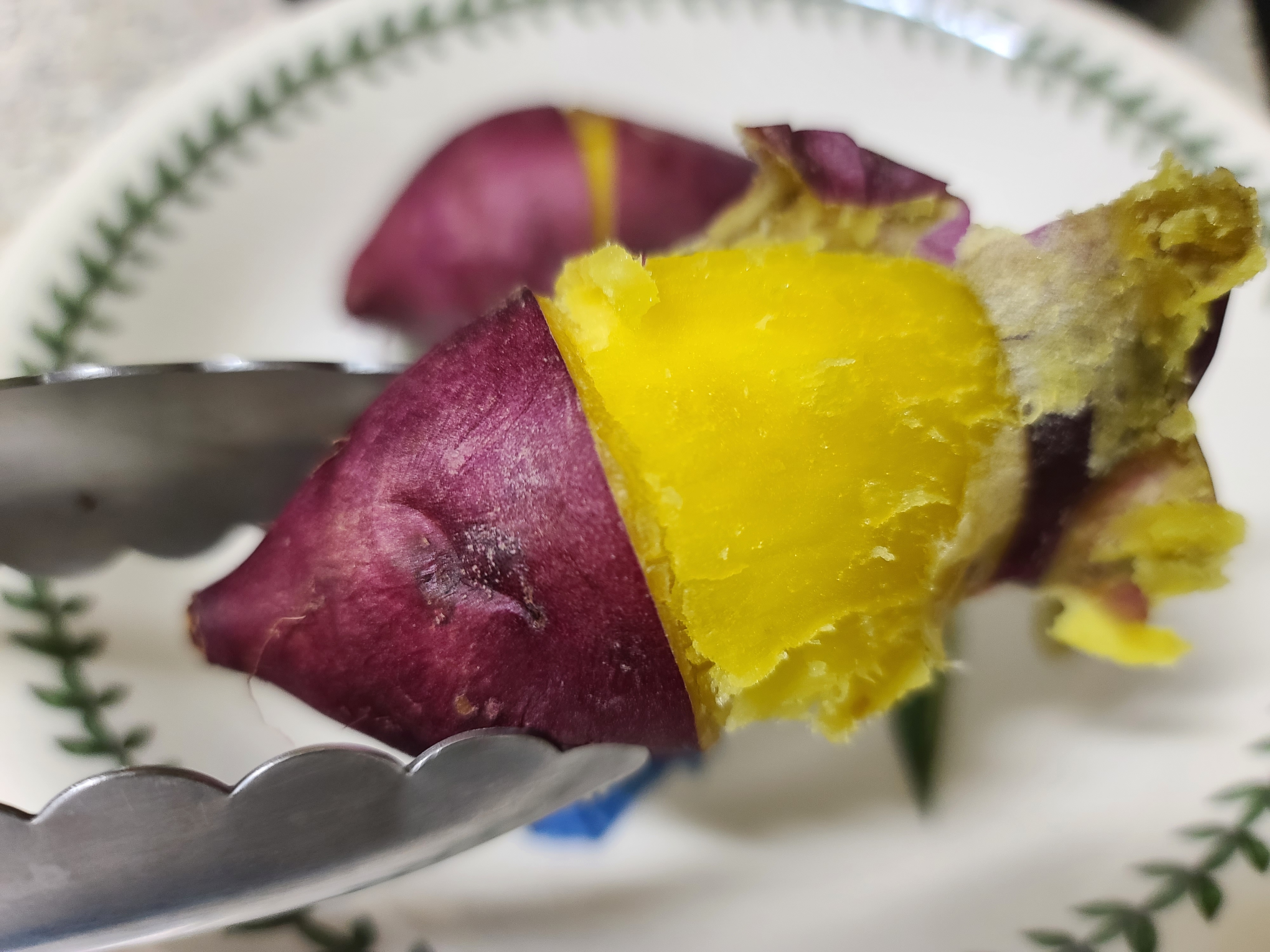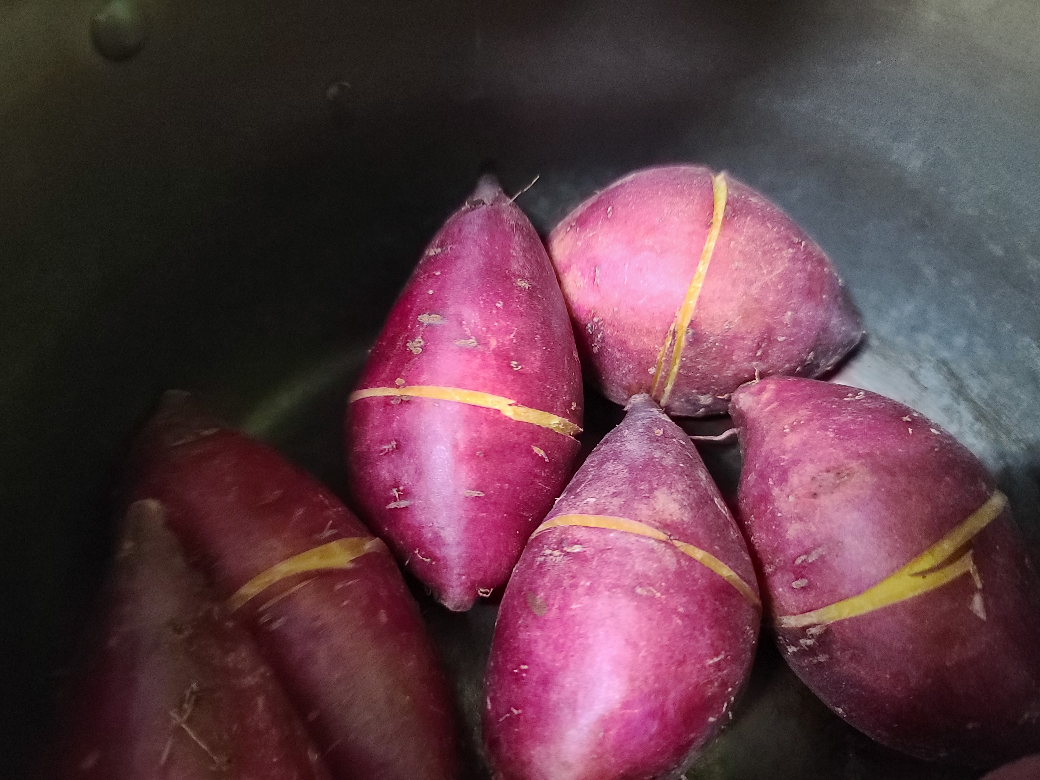 고구마 중앙에 이렇게 칼집을 해 놓은 이유는 삶은 뒤 껍질을 쉽고 수월하게 벗기기 위함입니다.