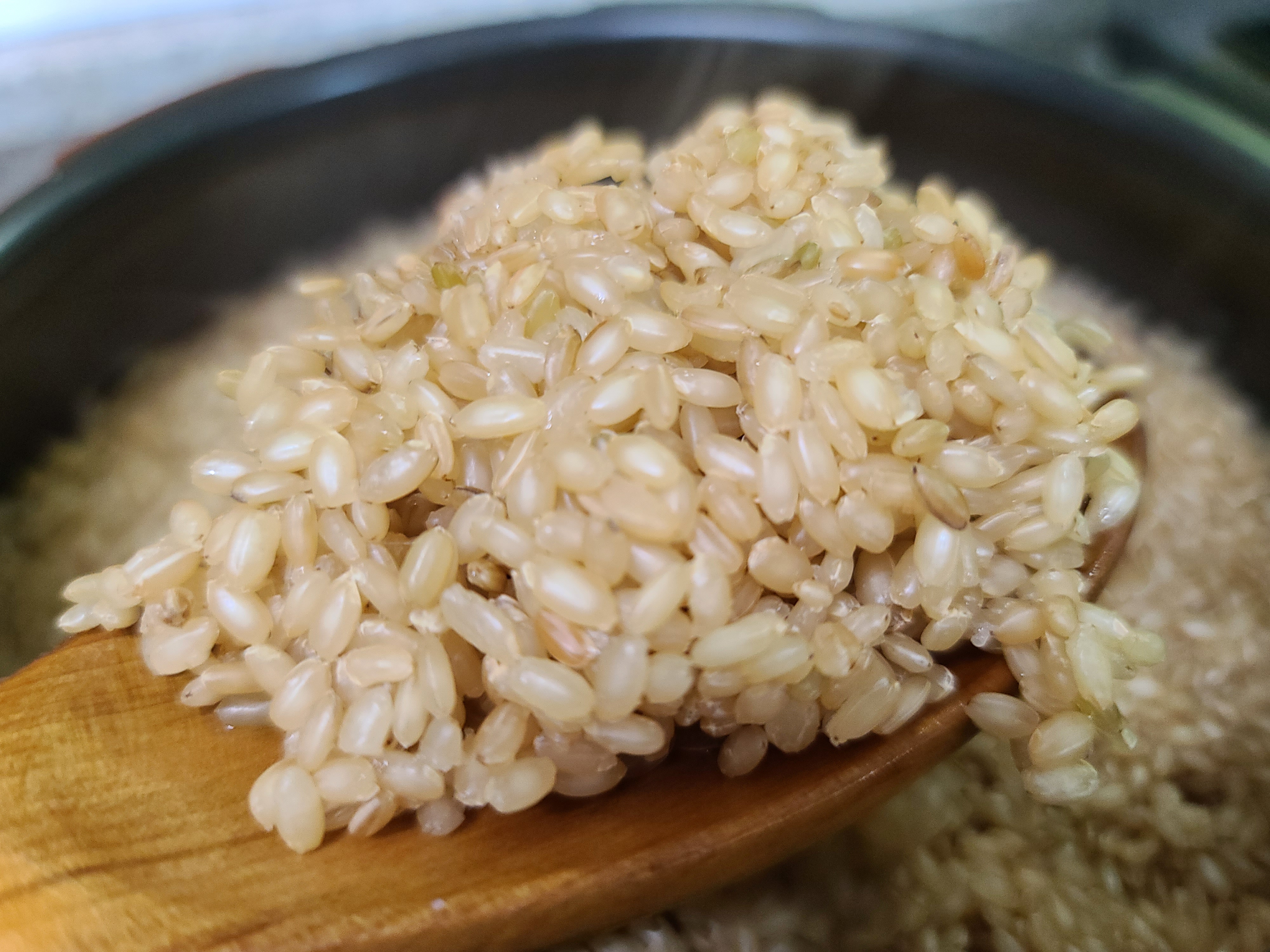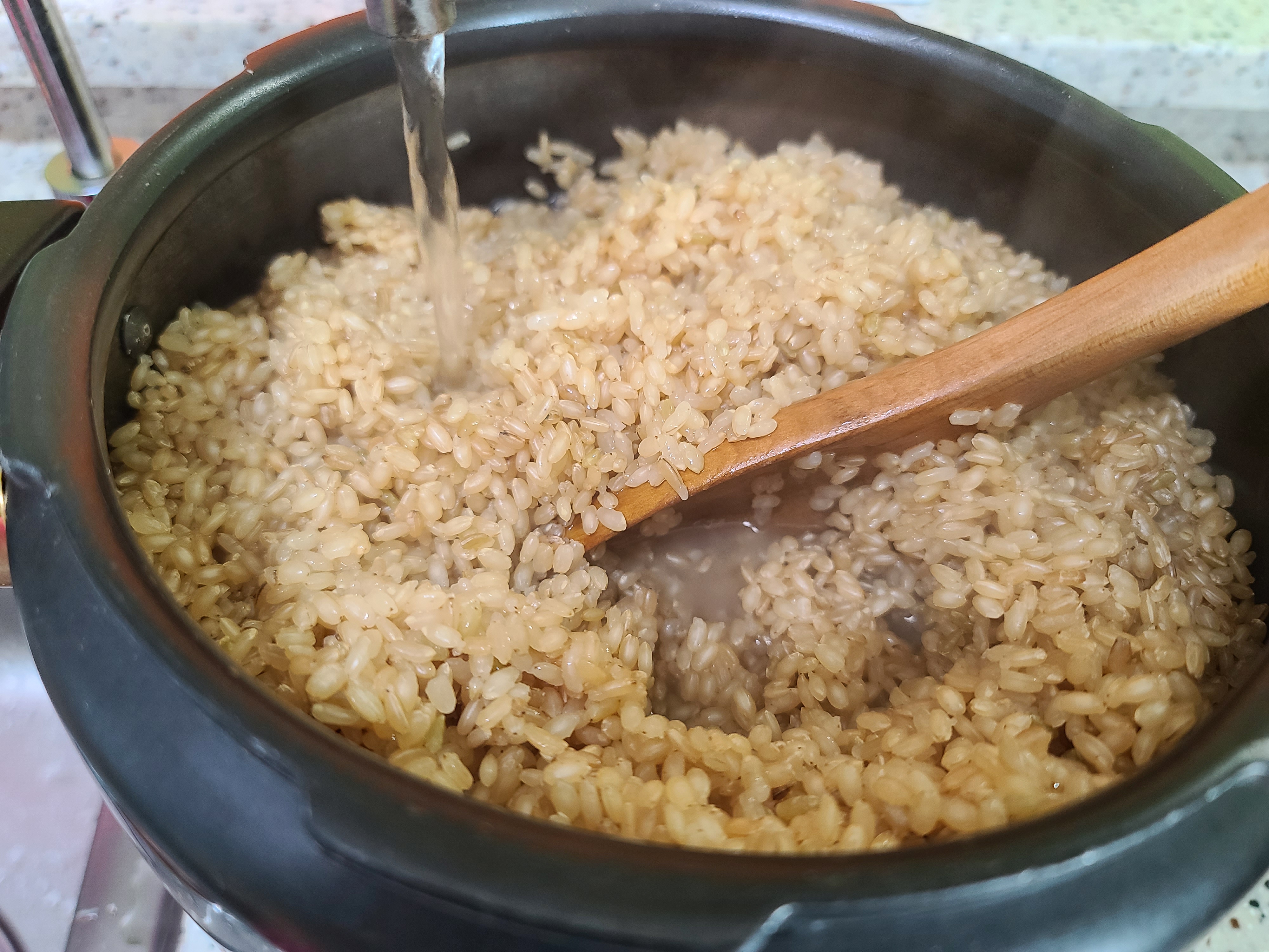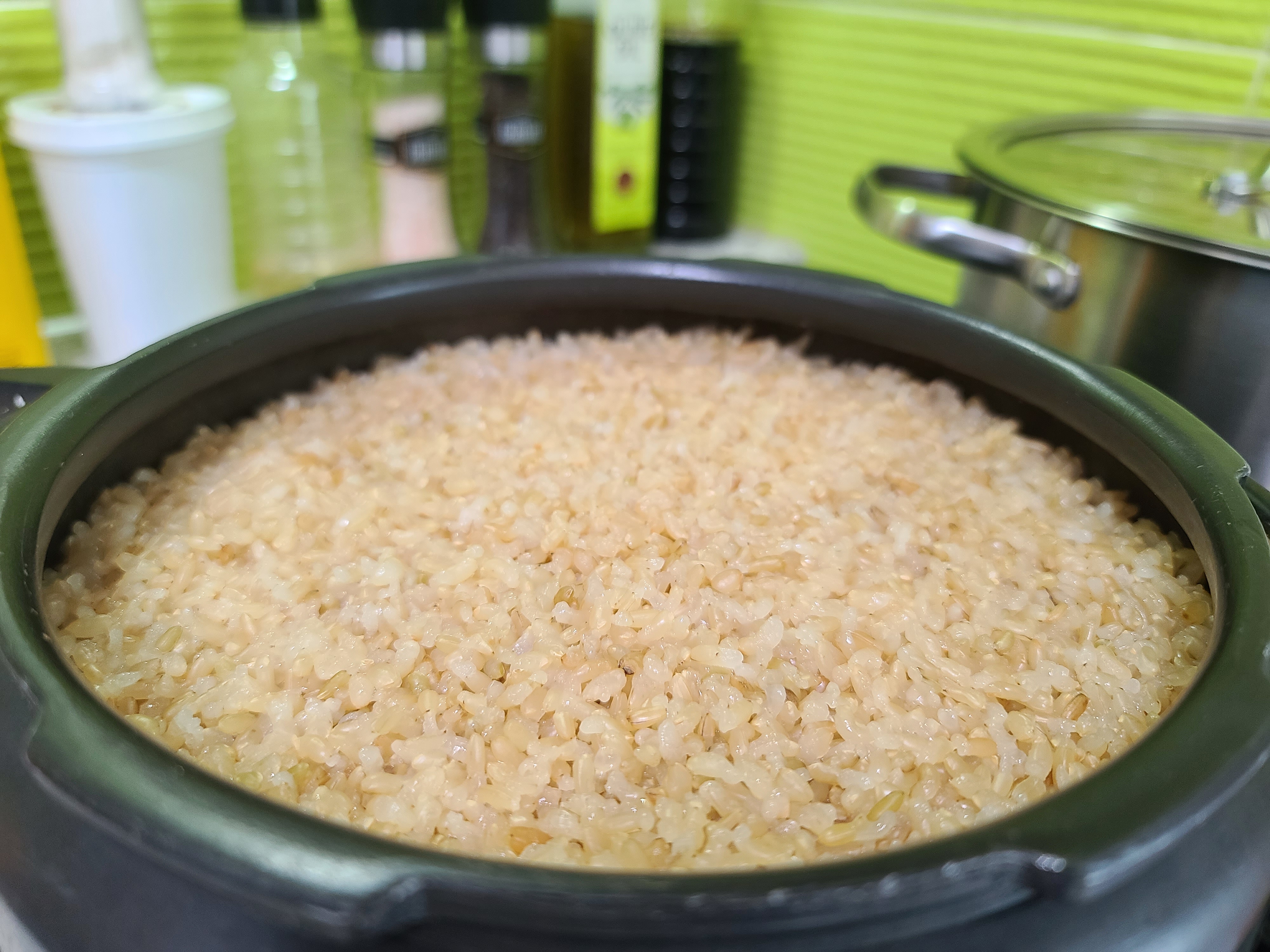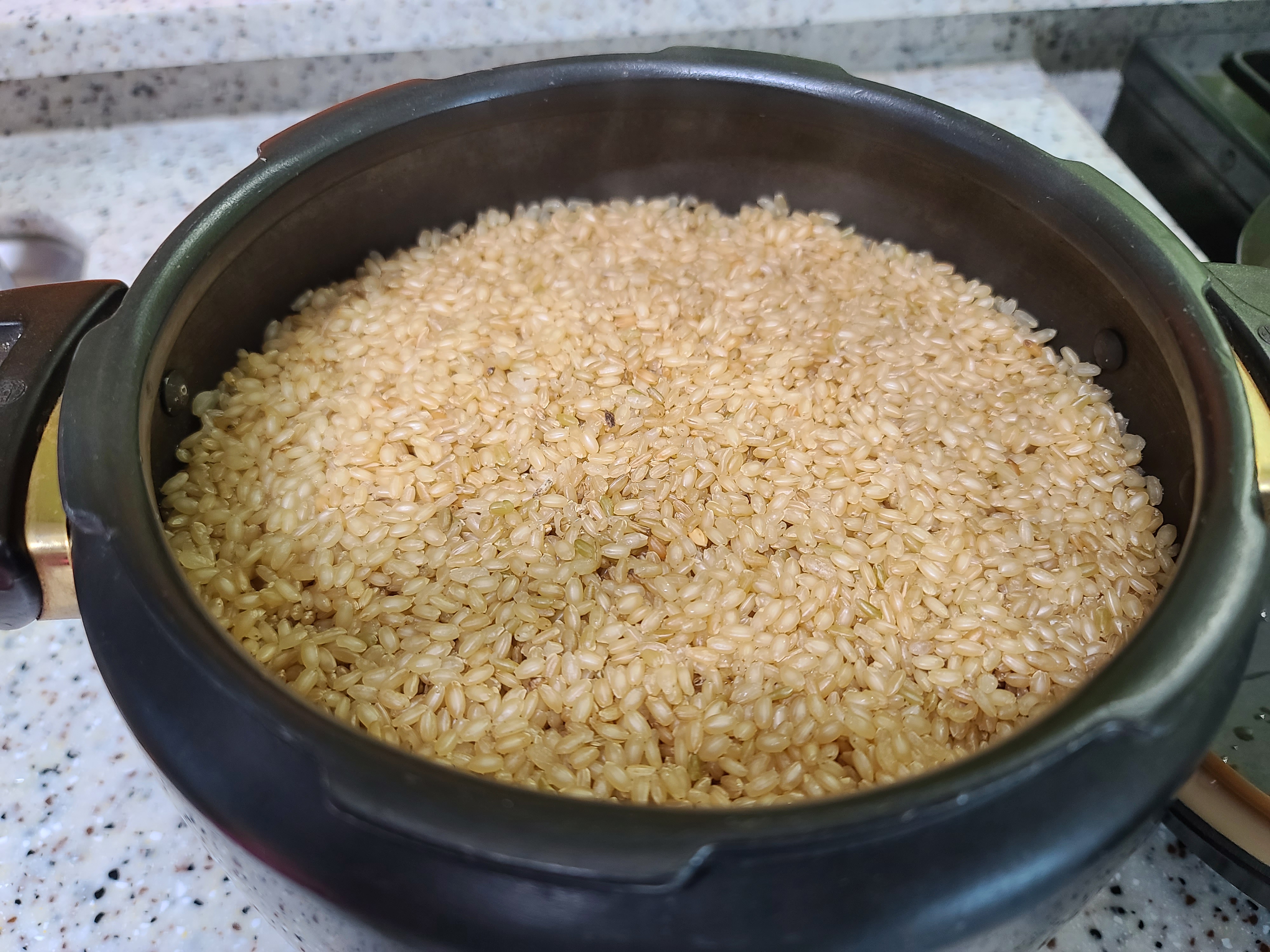 완성된 현미밥의 모습입니다. 정말 촉촉하게 잘 되었죠. 불리지 않고 밥을 한 모습이라곤 믿기지 않을 거예요.