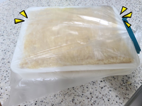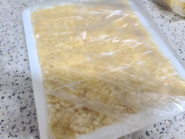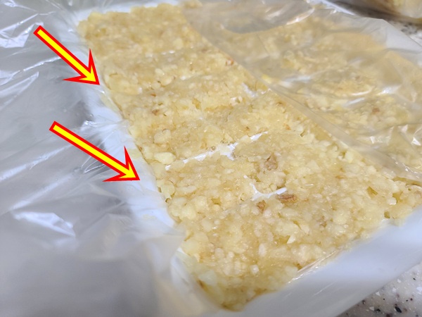 간 마늘을 다 빼곡히 채워 넣었다면 이렇게 비닐봉지를 감싼 뒤 밀봉해서 냉동실에 넣어야 마늘 냄새가 스멀스멀 나지 않습니다.