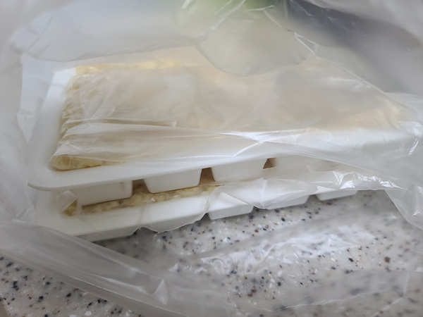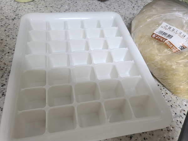 간 마늘을 얼음틀에 담기 전에 미리 비닐봉지나 랩을 깔아주고 간 마늘을 넣어야 해요. 그래야 나중에 냉동했을 때 분리하기가 쉽거든요.