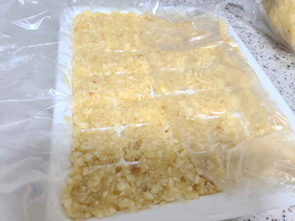 별거 아니지만 요런 게 바로 팁이 아닐까 해요. 조금만 신경 쓰면 살림에 아주 유용하니까요. 이렇게 비닐봉지를 먼저 깔고 간 마늘을 빼곡히 채워 넣은 뒤 냉동실에 얼리면 오랫동안 두고 드실 수 있답니다.