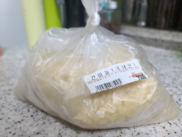 언제부터인가 마트나 재래시장에 가면 우리 주부님들 참 편하게 장보기 쉽게 되어 있죠. 그중에서 한 가지 마늘을 갈아서 파는 것인데요. 사실 집에서 일일이 마늘껍질을 벗기고 절구통에 빻고 했던 시절이 언제였던가 할 정도로 이젠 잊혀가는 일이 되었어요. 집에 간 마늘이 똑 떨어져 마트에 가서 간 마늘을 구입해 왔어요. 가격도 저렴하고 잘 보관만 하면 오랫동안 요리해 먹을 수 있어 전 자주 사 오는 편이에요.