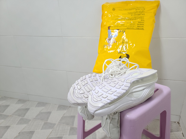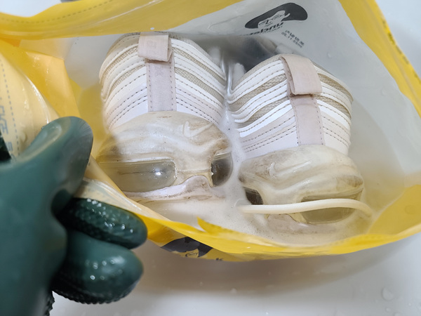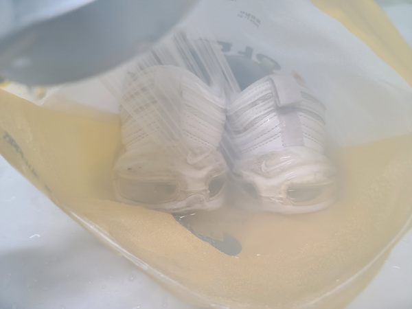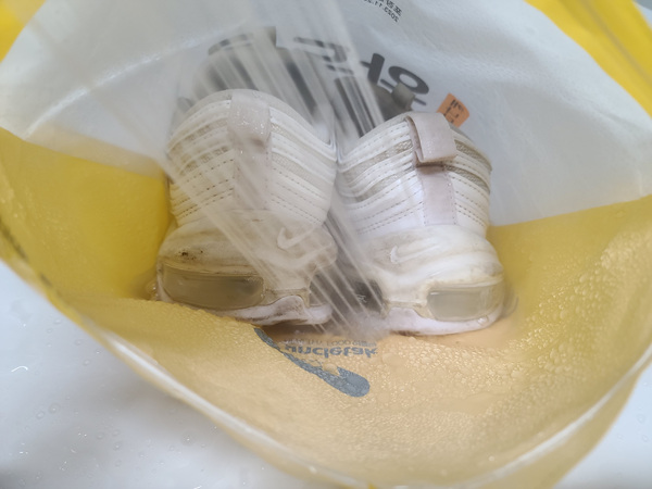 이렇게 지퍼백을 닫아 놓고 10분 정도 후에 세척을 하면 정말 쉽게 때가 빠진 상태를 확인할 수 있어요. 너무 오랫동안 담가두면 혹시나 신발 접착면이 온수로 인해 약해질 수 있으니 권장하지 않습니다.
